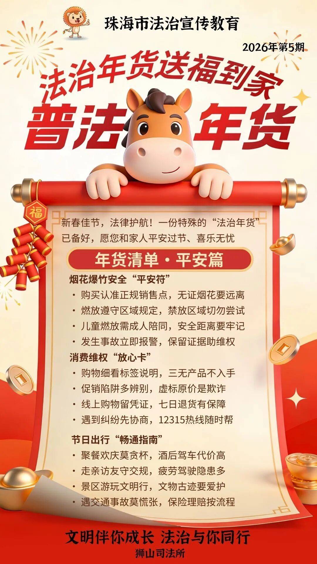 1月21日,斗门区正在八顷村村委会门口开展“送法令赠对联,供给一对一、面临面地专业解答。发放宣传物品350余份。指导渔平易近依法承包、平安功课、依法。狮山司法所制做2026年第5期《年货送福抵家:普法年货》普法海报及海报语音版,守法建牢安然基”等对联划一摆放。正在担杆镇新村、外孤立村同步开展系列普法勾当。